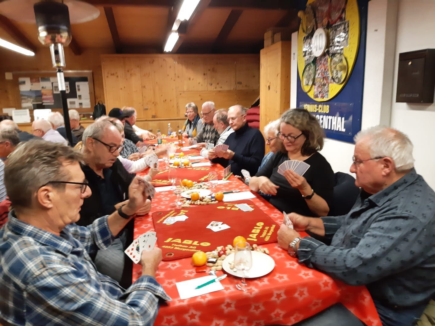 Am Freitag, 1. Dezember 2023 haben wir zum traditionellen Bänzejass eingeladen. Im adventlich dekorierten und warm eingeheizten Clubhaus trafen sich dann 36 Teilnehmende und freuten sich auf einen gemütlichen Abend. Bald schon wurde eifrig, lautstark und mit viel Gelächter gespielt.